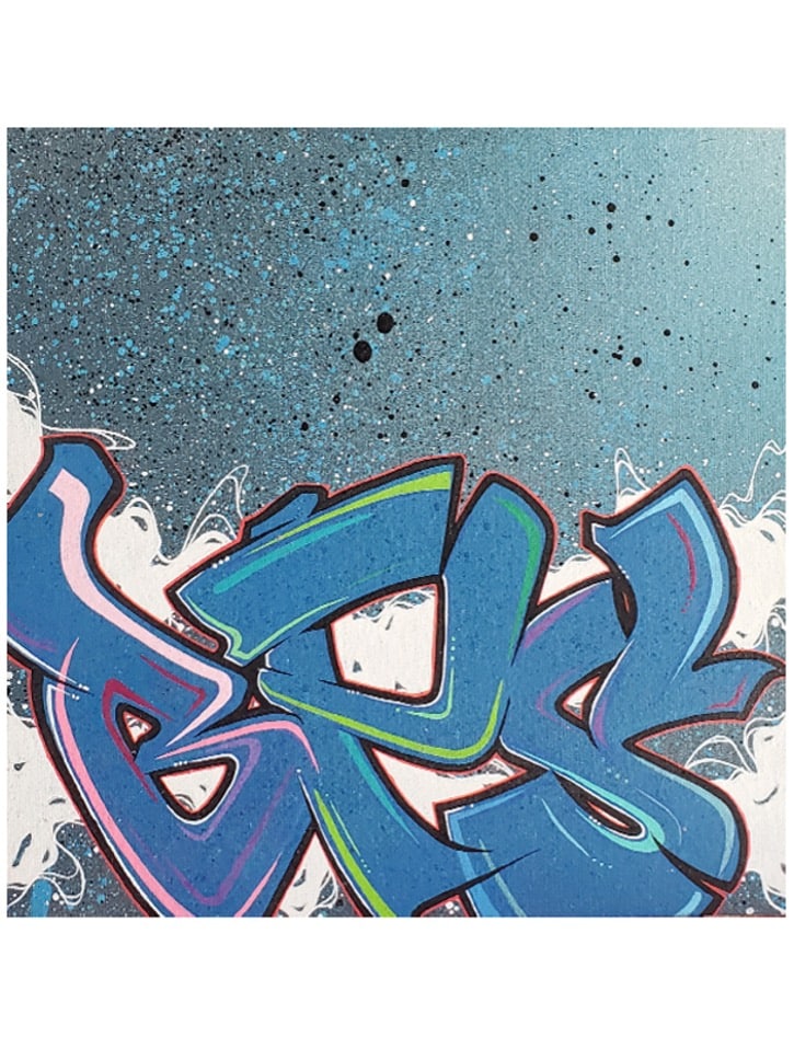 Lettrage aéré fait au marqueur, avec jet de peinture pour le fond
